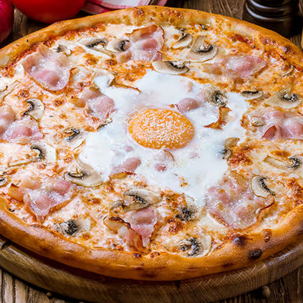 Queso crema, mozzarella, jamón, bacon, huevo, orégano.