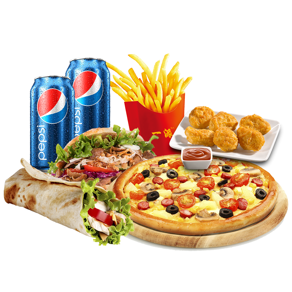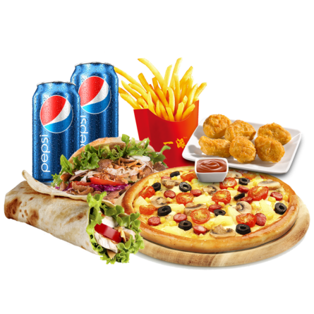 1 pizza mediana + 1 kebab o dürüm + 1 patatas o nuggets + 2 pepsi