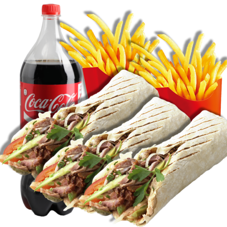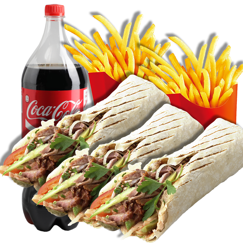 3 Dürüms + 2 patatas + coca-cola 1L.
