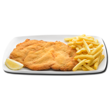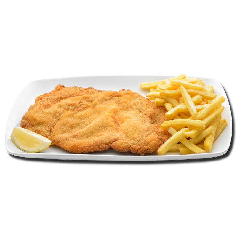 Pechuga de Pollo Empanada con Patatas Fritas.