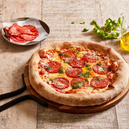 Salsa, carne picada, mozzarella, pepperoni, pimiento.