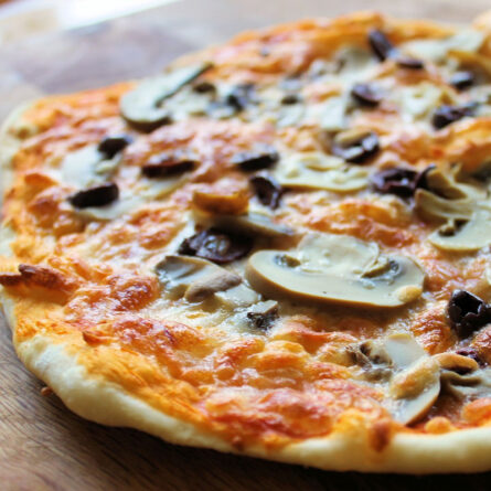 Salsa de tomate, jamón york, salami, champiñón, mozzarella